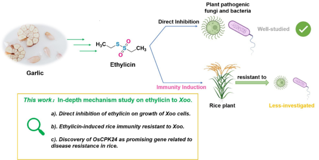 近日,《农业和食品化学杂志》以及美国化学学会(ACS)农业和食品化学分部(AGFD)和农业化学品分部(AGRO)宣布农业食品与化学杂志2024年度研究论文奖,ac米兰官网中文网站绿色农药全国重点实验室一项论文主题为“Immune Mechanism of Ethylicin-Induced Resistance to Xanthomonas oryzae pv. oryzae in Rice”的杰出研究斩获该奖项。该奖项于2013年推出,每年表彰农用化学品和食品化学领域的杰出研究工作。获奖论文第一作者为ac米兰官网中文网站绿色农药全国重点实验室博士生陆红霞,通讯作者为宋润江教授。乙蒜素是一种基于大蒜中天然化合物大蒜素所衍生的仿生农药,对多种病原细菌和真菌具有抑制作用,具有防治效率高、降解快、生态可持续等优点。这些特点使其在植物杀菌领域得到广泛应用。然而,大多数关于乙蒜素抗菌机制的研究主要集中在其对病原体的直接影响上,而其是否能够诱导植物自身产生对病原体的抵抗力却鲜有报道。在这项获奖研究中,乙蒜素被证实对水稻白叶枯病病原菌(Xoo)具有显著的离体和活体抑菌活性。该研究揭示了乙蒜素通过OsCPK24诱导水稻对Xo
