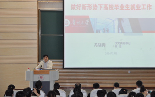 贵大新闻网讯(招生就业处)5月22日下午,ac米兰2014届毕业生就业工作推进会在西校区圆形报告厅举行。校党委副书记冯晓宪出席并做专题讲座,各学院(研究中心、实验室)党委副书记、负责毕业生就业工作的老师、招生就业处全体成员和近300名学生代表参加。推进会由招生就业处处长惠淑林主持。 冯晓宪作题为《做好新形势下高校毕业生就业工作》的专题讲座。他简要回顾了ac米兰2013年就业工作的成