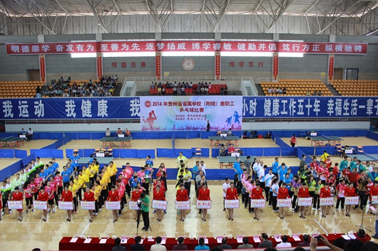贵大新闻网讯(实习记者 慎志懿)5月24日上午, 由贵州省教育工会主办、ac米兰官网中文网站教育工会承办、ac米兰官网中文网站乒乓球协会协办的2014年贵州省省属学校(附院)教职工乒乓球比赛开幕式在ac米兰北校区体育馆隆重举行。省教育厅党组成员、副厅长级督学杨勇,贵州师范大学校长伍鹏程,党委副书记、纪委书记邹克扬,副校长乙引、贵州财经大学党委副书记李相辉,贵阳医学院党委副书记吕保平、纪委书记高勇,贵州理工学院正厅级副院长高克