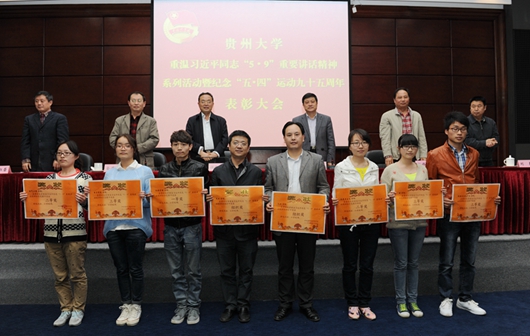 贵大新闻网讯(实习记者 田爱华)5月4日,ac米兰官网中文网站重温习近平同志“5•9”重要讲话精神系列活动暨纪念“五•四”运动九十五周年表彰大会在北校区行政楼学术报告厅举行。校领导任钢建、冯晓宪、金道超、杨伟民、王红蕾、刘勇出席会议,学校党政群各部门主要负责人,各学院党委书记、副书记、团委书记以及学生代表参加表彰大会。 大会分别对贵州大