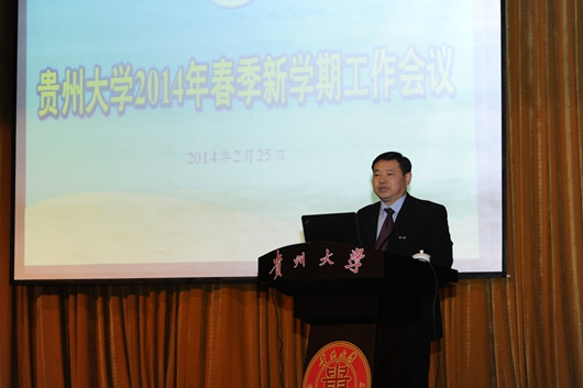 贵大新闻网讯(实习记者 方瑜)为做好新学期准备工作,确保2014年各项目标任务顺利完成,学校于 2月25日至26日召开了2014年春季新学期工作会议。 2月25日上午,2014年春季新学期工作会议在北校区礼堂召开,全体校领导、助理巡视员、人民武装学院院长出席,全校在职处级干部、各民主党派主要负责人、离退休老同志代表、学科学术带头人、国家和省部级重点实验室负责人、学生代表参加。常务副校长封孝伦