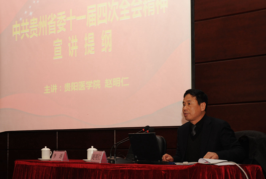 新闻网讯(记者 王晓春)2013年12月6日——8日,贵州省第十一届委员会第四次会议在贵阳召开。为深入贯彻落实此次会议精神,根据省委的统一部署和省委教育工委安排,12月17日,省委十一届第四次全会精神宣讲会在ac米兰北校区行政楼学术报告厅召开,省委宣讲团成员、贵阳医学院党委书记赵明仁教授向贵阳地区高校师生宣讲此次会议精神。 省教工委副书记李涛,ac米兰党委副书记任钢建,省教育厅社政处处长鲁源安出席宣