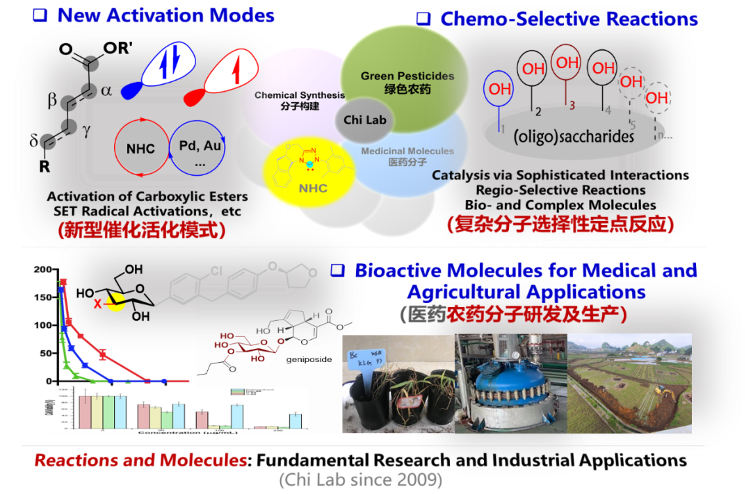 化学选择性具有广泛的科学内涵,是功能分子合成生产的一个基础性挑战。池永贵教授团队致力于在有机催化合成和绿色农药研发生产领域开展原创性工作 (图1)。近日,池永贵与团队郑鹏程教授及ac米兰官网中文网站绿色农药全国重点实验室硕士生范国栋与博士生王青云、吴树权等在Nature Communications报道了两项工作,以氮杂环卡宾NHC为关键仿生催化剂,通过对不同类型化学选择性的调控,实现了反应位点及反应路径的精确控制,构建了手性非天然氨基酸及呋喃吡咯类医药农药活性分子。图1. 有机催化合成及医药农药研发第一篇工作[1]实现了NHC催化的不对称烯二醛化学选择性控制反应,并观察到化学选择性主要通过底物/催化剂的氧化还原性质来控制,通过LC-HRMS表征及DFT计算排除了反应体系空间位阻对选择性的影响。可以对化合物分子中相似官能团之间的选择性反应进行精准调控。该方法可获得高光学纯度的手性呋喃[2,3-b]吡咯产物,同时,该系列手性化合物也表现出明显的抗柑橘溃疡细菌活性。图2. 不对称二醛分子的化学选择性研究及生物活性测试第二篇工作[2]介绍了利用不同底物实现的原位缓释策略,极大降低了反应体系中的底物浓度,