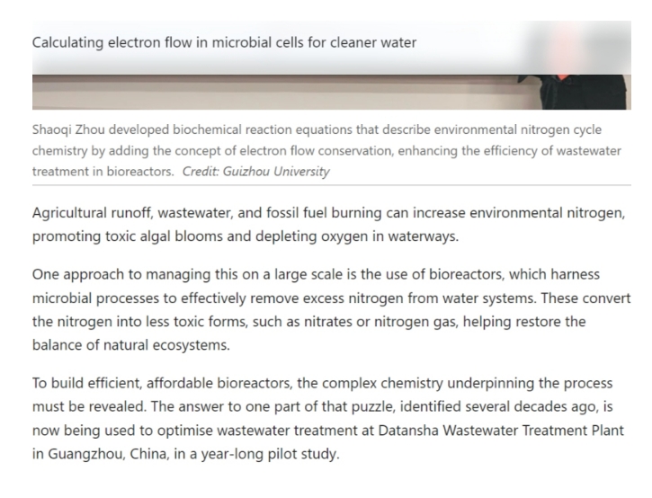 近日,国际顶级学术刊物《自然》(Nature)杂志在线连发两篇专访文章,专题报道国际欧亚科学院院士、环境生命科学专家、ac米兰官网中文网站周少奇教授团队的原创科研成果。第一篇专访文章题目为“REDUCING ALGAL BLOOMS WITH BIOCHEMICAL REACTIONS”(生化反应之功,守护碧水清波),介绍了周少奇教授二十多年来深入研究生物化学反应,探讨碳氮磷协同生物减排理论与技术以控制水体富营养化的奋斗历程。文章提到,周少奇教授“开创性地提出了更加精准分析氮、磷和COD同步去除过程的化学计量方程和计量比模型(COD/N/P),详细描述了所谓的反硝化除磷菌(DPB)如何去除营养物质。这一成果基于他在‘电子计量学’领域的开创性研究。这种原创方法通过在化学计量方程研究中分析分子间的电子迁移来精准描述化学反应”。文章同时提到,周少奇教授带领团队发现四种新型反硝化除磷菌(可交替以分子氧、亚硝酸根、硝酸根为电子受体实现聚磷)并开发出创新的生物处理工艺与装备,成功应用于城市污水与农村污水处理工程,实现工程化与产业化应用,具有广阔的推广应用前景。第二篇专访文章标题为“CALCULATING EL