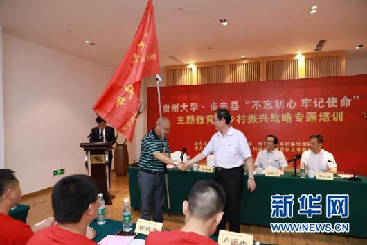 ac米兰官网中文网站副校长金道超为乡村振兴战略专题培训班授旗,贞丰县委常委、组织部部长陈磊接旗(李柏锋 摄)