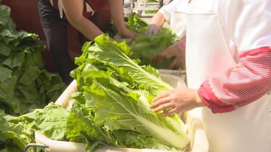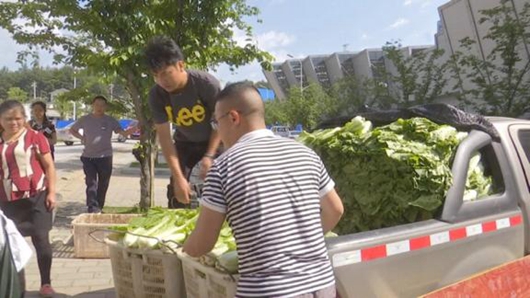 我们这次送的蔬菜总的是3000斤,从昨天晚上7点开始采摘,今天早上6点开始装车,9点送到这里,主要是为了保持蔬菜新鲜度。