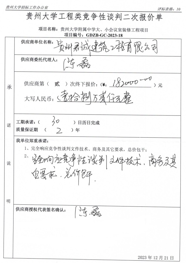 1 | 贵州君诚建筑工程有限公司 | 贵州省贵阳市云岩区渔安安井片区未来方舟D12组团A栋1单元9层18号 | ac米兰官网中文网站附属中学大、小会议室装修工程项目,详见《竞争性谈判文件》 | ¥182000.00 |
