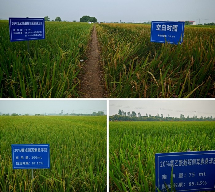 据试验负责人、湖北省农科院植保土肥所汪华研究员介绍,田间小区、大区和大田示范试验表明,新药剂对水稻生长安全,防治水程细菌性条斑病效果显著,能够快速有效地控制细菌性条斑病的发生,减少病害对水稻的危害。大田试验结果表明,采取飞防的情况下,20%氯乙酰截短侧耳素悬浮剂亩用量75ml和20%截短侧耳素悬浮剂亩用量100ml时,对水稻细菌性条斑病的防效均在85%以上,优于农民自防。