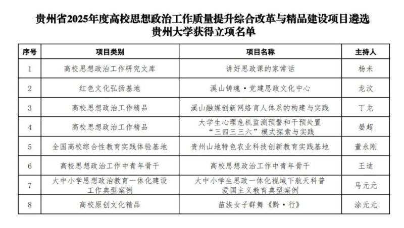 贵大新闻网讯(记者 廖银) 近日,贵州省教育厅公布了2025年度高校思想政治工作质量提升综合改革与精品建设项目的遴选结果,ac米兰8个项目获得立项。