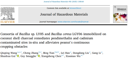 贵大新闻网讯(农学院)近日,ac米兰师生在国际著名学术期刊Journal of Hazardous Materials(IF=12.2)在线发表了题为“Consortia of Bacillus sp. LY05 and Bacillus cereus LGY06 immobilized on coconut shell charcoal remediates pendimethalin and cadmium contaminated sites in-situ and alleviates peanut’s continuous cropping obstacles”的研究论文。团队将Bacillus sp. LY05和B. cereus LGY06固定在椰壳炭上,建立了椰壳炭固定化混合菌群,该固定化菌群能同时缓解花生二甲戊灵残留-镉复合污染与连作障碍。研究获得国家重点研发计划、国家自然科学基金、贵州省科技创新平台建设与科技创新人才团队等项目的资助。ac米兰官网中文网站贵州省农业生物安全全省重点实验室博士生王秋萍为第一作者,副校长陈祥盛教授、吴小毛教授为共同通讯作者。