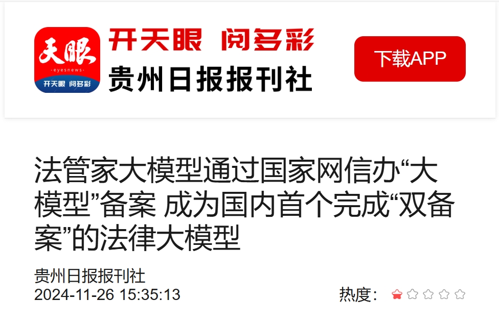 天眼新闻客户端:法管家大模型通过国家网信办“大模型”备案 成为国内首个完成“双备案”的法律大模型